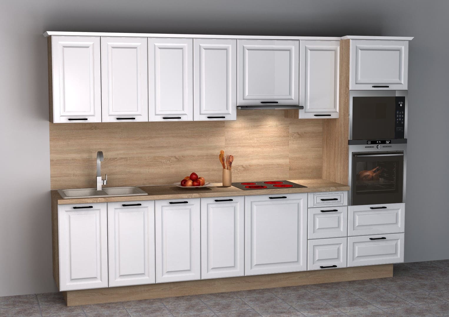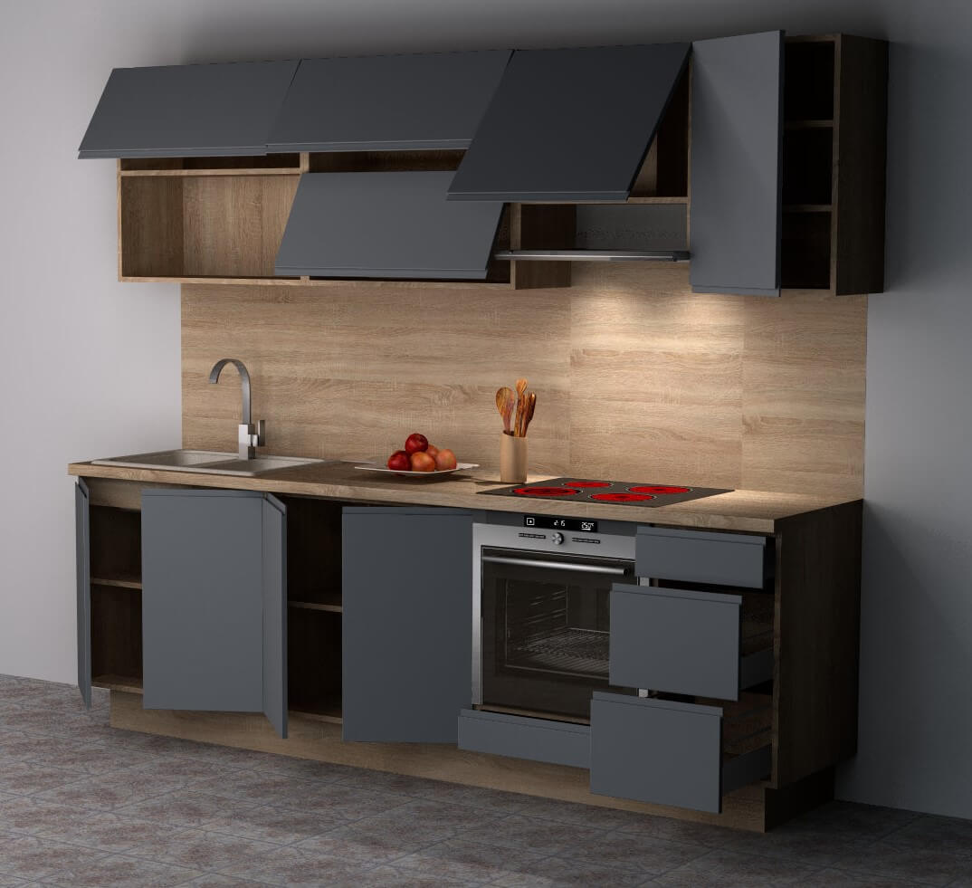 Modern és praktikus konyhai bútor, amely maximális tárolóhelyet és stílusos megjelenést kínál. Tartós 18 mm vastag bútorlap, állítható lábak, sima működésű csillapítós ajtópántok és fékes fiókcsúszók gondoskodnak a kényelemről és stabilitásról. Ideális választás minden konyhába!